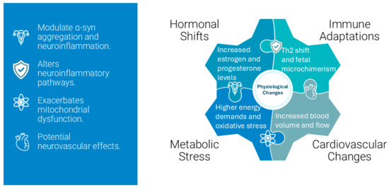 Key physiological changes during pregnancy, including hormonal fluctuations, immune adaptations, metabolic stress, and cardiovascular changes, interact with MSA pathophysiology. These changes may influence neuroinflammation, α-syn aggregation, and mitochondrial function, potentially altering disease progression.