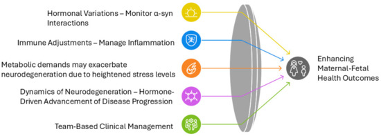 Pregnancy does not appear to provide a pronounced neuroprotective or immunomodulatory environment for PD as it does for MS. However, PD, primarily characterized by dopaminergic neuronal loss in the substantia nigra and the presence of Lewy bodies (intraneuronal α-syn aggregates), is less common among women of childbearing age [63]. Consequently, data on the direct impact of pregnancy on PD are more limited. Small-scale observations and case reports suggest that pregnant women with PD may experience stable or variably fluctuating symptoms rather than consistent improvement or worsening. Hormonal changes might modestly influence dopaminergic function or neurochemical signaling, but no clear, reproducible pattern as in MS has emerged. Management complexities arise from the need to adjust PD medications-many of which are dopaminergic agonists or levodopa, due to teratogenic concerns. This can indirectly affect the stability of PD symptoms [60].