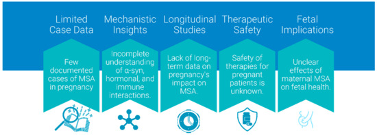 Given the lack of documented cases of MSA pregnancies, this section extrapolates from known effects of pregnancy on neurological disorders, particularly PD [64], to hypothesize potential interactions between pregnancy-induced changes and MSA progression. MSA, like PD, is a synucleinopathy, but differs substantially in its underlying pathology and clinical presentation. MSA involves the accumulation of α-syn within oligodendrocytes, leading to widespread neurodegeneration affecting autonomic centers, the cerebellum, and the basal ganglia. Unlike MS, which is strongly influenced by immune-mediated mechanisms, MSA is considered a primarily sporadic disorder with more complex and less understood neuroinflammatory and glial dysfunction components [5]. While immune modulation plays a role in MSA pathology, it does not manifest as a relapsing-remitting disease with an overt inflammatory hallmark. Thus, the profound pregnancy-induced immunological tolerance that benefits MS patients may not confer equivalent advantage in MSA. While PD might present mild or stable symptom fluctuations during pregnancy, MSA involves widespread autonomic instability., e.g., severe orthostatic hypotension, urinary dysfunction and potentially rapid disease progression [63,65]. These features can be exacerbated by the hemodynamic and metabolic stresses of pregnancy. Since MSA generally occurs in older adults, instances of pregnancy affected by MSA are rarely documented, limiting the availability of empirical data. Nevertheless, the lack of a consistent immunologically mediated driver in MSA suggests that pregnancy’s immunomodulatory environment would not exert the stabilizing influence seen in MS [66]. Similarly, the complex neuropathology and higher severity level of autonomic compromise in MSA may overshadow any subtle hormonal neuroprotective effects that could, in theory, benefit other neurodegenerative conditions.