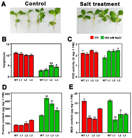 Phenotypic analysis and physiological index detection of transgenic tobacco plants under salt stress. (A) Phenotypic analysis of transgenic tobacco plants under salt stress (150 mM NaCl). (B) Plant height of WT and transgenic tobacco plants. (C) POD activity of WT and transgenic tobacco plants. (D) Proline content of WT and transgenic tobacco plants. (E) MDA content of WT and transgenic tobacco plants. WT: wild-type; L1–L3: different transgenic lines; * indicates a p-value < 0.05; ** indicates a p-value < 0.01.