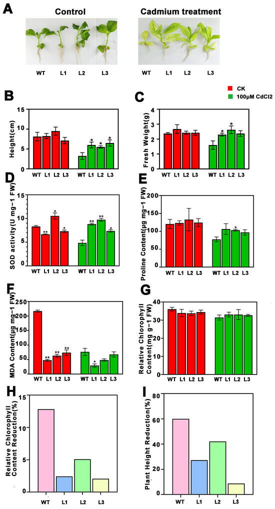 Phenotypic analysis and physiological index detection of transgenic tobacco plants under cadmium stress. (A) Phenotypic analysis of transgenic tobacco plants under cadmium stress (100 μM CdCl2). (B) Plant height of WT and transgenic tobacco plants. (C) Fresh weight of WT and transgenic tobacco plants. (D) SOD activity in WT and transgenic tobacco plants. (E) Proline content of WT and transgenic tobacco plants. (F) MDA content of WT and transgenic tobacco plants. (G) Relative chlorophyll content of WT and transgenic tobacco plants. (H) Relative chlorophyll content reduction in WT and transgenic tobacco plants. (I) Plant height reduction in WT and transgenic tobacco plants. WT: wild-type; L1–L3: different transgenic lines; * indicates a p-value < 0.05; ** indicates a p-value < 0.01.