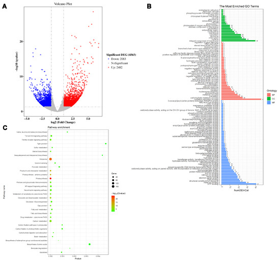 RNA-Seq analysis of transgenic tobacco plants. (A) Volcano plot of DE (differentially expressed) genes. (B) GO analysis of the DE genes. (C) KEGG analysis of the DE genes.