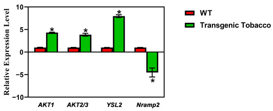 Following further screening of the RNA-Seq results, it was noted that there were remarkable changes in the expression of some metal-ion transporters in the transgenic plants overexpressing PsnMLP328. The log2-fold change in the potassium ion channels AKT1 and AKT2/3 were 2.4 and 1.7 in transgenic plants, respectively. The log2-fold change of the heavy metal–nicotinamide transporter YSL2, which mediates Cd2+ transport from root to shoot, was 3.5, whereas the expression of Nramp2-like was -2.1 (Table 2).