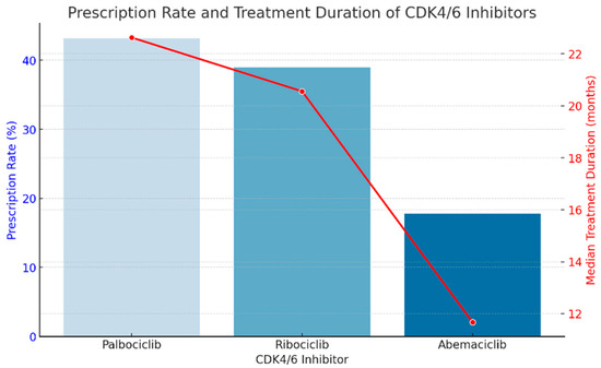 The percentage of prescriptions for each CDK4/6 inhibitor (blue bars) and the median duration of treatment (red line).