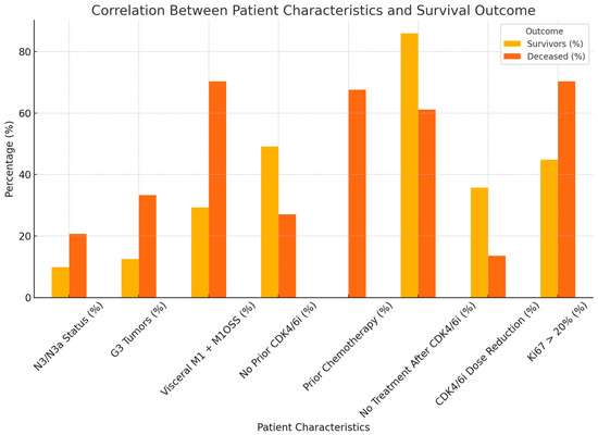 We created a comparative graph (Figure 2) that highlights the differences between the survivors and the deceased patients according to relevant clinical characteristics. It clearly shows that the presence of multiple metastases (Visceral M1 + M1OSS) and a high Ki67 (>20%) were associated with a higher rate of deaths, with statistical significance. Also, reducing the dose of CDK4/6i seems to be associated with better survival.