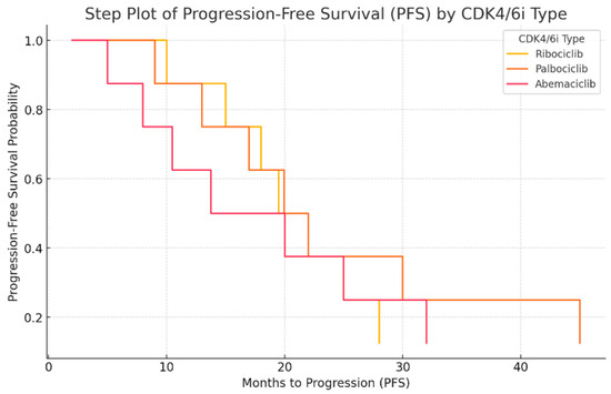 The next figure presents the Kaplan–Meier-like step plot (Figure 3) for progression-free survival (PFS) by CDK4/6 inhibitor type. This graph represents the probability of remaining progression-free over time. Palbociclib shows the longest PFS, with a slower decline in survival probability. Ribociclib has a moderate PFS, with a slightly steeper drop. Abemaciclib has the shortest PFS, indicating faster disease progression in these patients. This step plot provides a clearer survival probability estimation and is aligned with standard Kaplan–Meier survival analysis.