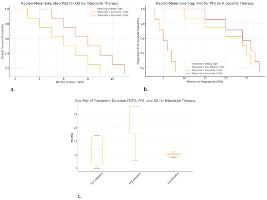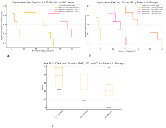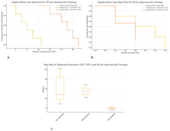 The Kaplan–Meier-like step plot for progression-free survival (PFS) shows the probability of being progression-free over time. The Kaplan–Meier-like step plot for overall survival (OS) shows survival probability over time. The box plot for treatment duration (TOT), PFS, and OS shows the distribution and variability of treatment outcomes. The Kaplan–Meier-like plots are ideal for time-to-event analysis, while the box plot is useful for understanding the variability in patient responses.