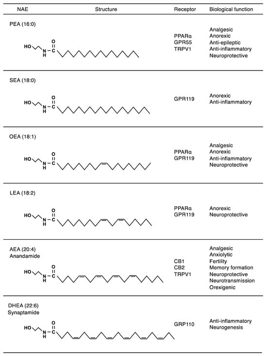 - Mock, E.D.; Gagestein, B.; van der Stelt, M. Anandamide and other N-acylethanolamines: A class of signaling lipids with therapeutic opportunities. Prog. Lipid Res. 2023, 89, 101194. [Google Scholar] [CrossRef] [PubMed]