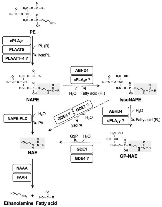 APA StyleUyama, T., Sasaki, S., Okada-Iwabu, M., & Murakami, M. (2025). Recent Progress in N-Acylethanolamine Research: Biological Functions and Metabolism Regulated by Two Distinct N-Acyltransferases: cPLA2ε and PLAAT Enzymes. International Journal of Molecular Sciences, 26(7), 3359. https://doi.org/10.3390/ijms26073359