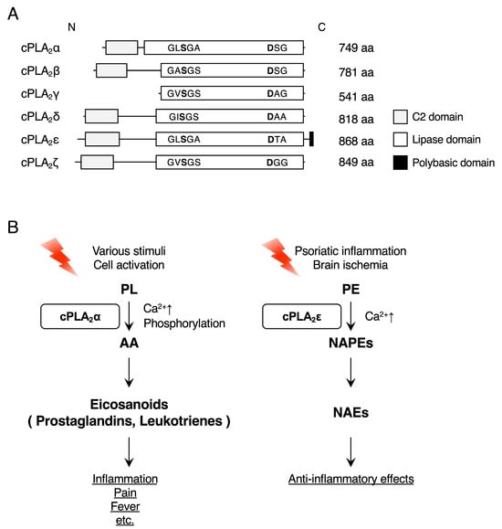 - Murakami, M.; Takamiya, R.; Miki, Y.; Sugimoto, N.; Nagasaki, Y.; Suzuki-Yamamoto, T.; Taketomi, Y. Segregated functions of two cytosolic phospholipase A2 isoforms (cPLA2α and cPLA2ε) in lipid mediator generation. Biochem. Pharmacol. 2022, 203, 115176. [Google Scholar] [CrossRef]