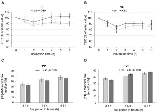 The flux marker [3H]-D-Mannitol was measured from the mucosal to the serosal side to assess the paracellular permeability. Over the entire period of the last 4 h, no significant difference in paracellular permeability could be detected between the control and the incubation with 40 µM CBD in both PP (n = 17; Figure 1C) and VE (n = 15; Figure 1D).