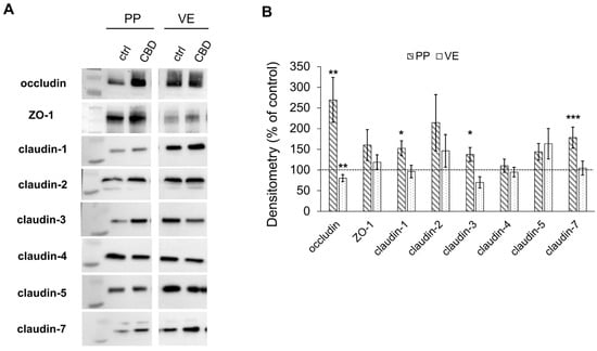 Expression of tight junction proteins after 6 h of incubation with 40 µM of CBD in Peyer’s Patch (PP) and villus epithelium (VE). (A) Western blots and (B) Densitometry of tight junction proteins (Kruskal–Wallis test, * p < 0.05; ** p < 0.01; *** p < 0.001; n = 5–7). The CBD-treated group is compared to controls, which were set to 100% and are shown as the dotted line.