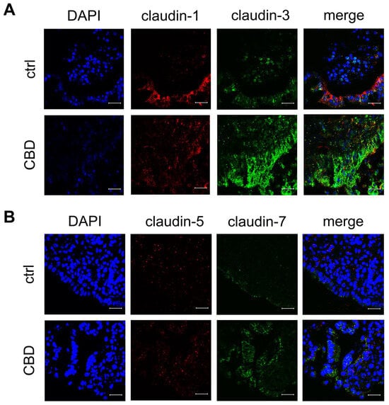 Immunofluorescent staining of follicle-associated epithelium within Peyer’s Patch (PP) after 6 h of incubation with 40 µM of CBD. (A) claudin-1 (red) and claudin-3 (green), as well as (B) claudin-5 (red) and claudin-7 (green). Nuclei were stained in blue (DAPI; n = 7; scale bar: 20 µm; representative images).