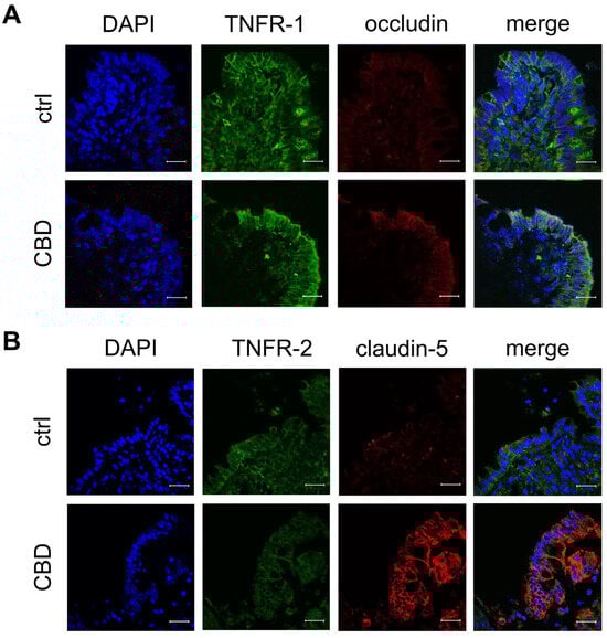 Confocal laser microscopy images of TNF receptors and tight junction proteins in Peyer’s Patch (PP) after incubation with 40 µM of CBD for 6 h. Immunofluorescent staining of (A) TNFR-1 (green) and occludin (red), (B) TNFR-2 (green) and claudin-5 (red). Nuclei were stained in blue (DAPI; scale bar: 20 μm; n = 7; representative images).
