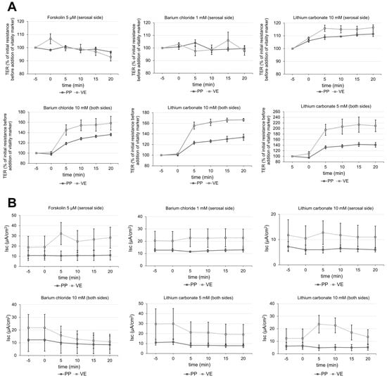 Analysis of different vitality markers for Peyer’s Patch (PP) and villus epithelium (VE). After 3 h [Forskolin 5 µM (serosal side), barium chloride 1 mM (serosal side), and lithium carbonate 10 mM (serosal side)] or after 10 h [barium chloride 10 mM (both sides), and lithium carbonate 5, 10 mM (both sides)] in the Ussing chamber the vitality marker was added, and the (A) TER along with the (B) short-circuit current (Isc) were recorded for 20 min. The TER value 5 min before addition was set to 100% (n = 3–4).