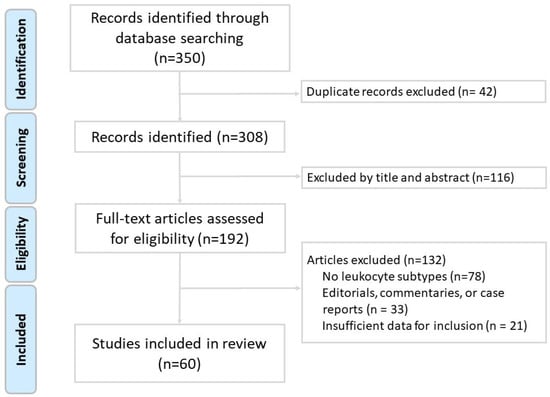 The inclusion criteria encompassed original research articles involving human, animal, or in vitro studies; reviews and meta-analyses relevant to the immune pathogenesis of chronic obstructive pulmonary disease (COPD); studies published in English; and articles that specifically addressed the role of leukocyte subtypes in COPD pathogenesis, inflammation, exacerbations, or therapeutic strategies. The exclusion criteria included case reports, editorials, conference abstracts, letters, and studies that were unrelated to leukocyte subtypes or not specific to COPD. Two independent reviewers screened the titles and abstracts for relevance and performed full-text evaluations of potentially eligible articles. Any discrepancies were resolved through discussion or consultation with a third reviewer. As shown in the study flow diagram (Figure 1), after screening 350 records, a total of 60 studies met the inclusion criteria and were included in the final review. We did not perform a formal risk-of-bias assessment or grade the level of evidence, as is typical for narrative reviews. However, preference was given to recent high-impact publications, systematic reviews, and clinically relevant studies. The data extracted included leukocyte functions, biomarkers, disease associations, and implications for patient management and treatment.