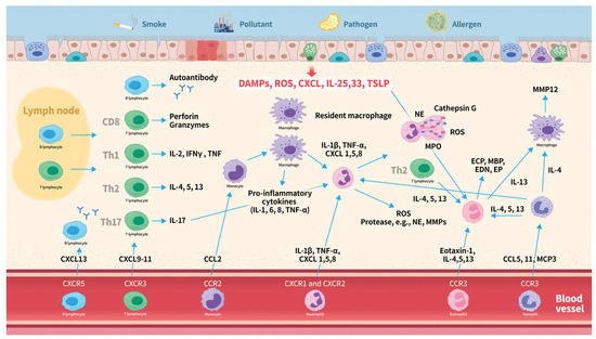 The pathogenesis of COPD in relation to leukocyte subtypes is summarized in Figure 2. It often begins with inflammatory responses triggered by inhaled irritants, such as smoke, pollutants, or pathogens. Damaged epithelial cells release ROS, TSLP, IL-33 and -25, and CXCL8. This response activates inflammatory pathways, leading to inflammation and tissue damage. C-X-C chemokines serve as attractants for neutrophils and bind to CXC chemokine receptors on the surface of these neutrophils, thereby facilitating their recruitment. Activated neutrophils release ROS, cytokines, chemokines, and proteases, which further amplify the inflammatory response. Neutrophil extracellular traps contribute to lung tissue damage and inflammation. Chemotactic cytokines such as CXCL9, CXCL10, and CXCL11, recruit T lymphocytes expressing CXCR3, whereas CXCL13 recruits B lymphocytes expressing CXCR5. CD8+ cytotoxic T lymphocytes contribute to the inflammatory response by releasing pro-inflammatory cytokines, including IFN-γ and TNF-α, perpetuating inflammation and tissue damage. Th1 cells mainly produce IL-2, IFNγ, and TNF, while Th2 cells primarily secrete IL-4, IL-5, and IL-13. Both phenotypes play distinct roles in the inflammatory responses in the lungs. B cells produce autoantibodies that may contribute to tissue inflammation. Upon activation by various inflammatory stimuli, monocytes migrate to the lungs, where they differentiate into macrophages. Activated circulating and resident macrophages release cytokines and chemokines, which recruit additional immune cells. Eotaxin-1 recruits eosinophils to the airways by binding to the CCR3 receptor. IL-4, 5, 13, and 33, and TSLP further enhance eosinophilic activity. Eosinophils release a variety of inflammatory mediators, including IL-4, IL-5, IL-13, TGF-β, ROS, ECP, MBP, EP, and EDN. These mediators contribute to inflammation, airway remodeling, and hyperresponsiveness. Basophils express the CCR3 receptor, which is activated by CCL5, CCL11, and MCP-3. Upon activation, basophils release elastase, IL-4, IL-13, IL-8, and CCL5, which promote the recruitment of neutrophils, eosinophils, and macrophages. The activation of these different types of leukocytes triggers an inflammatory response, resulting in airway inflammation, remodeling, and tissue destruction.