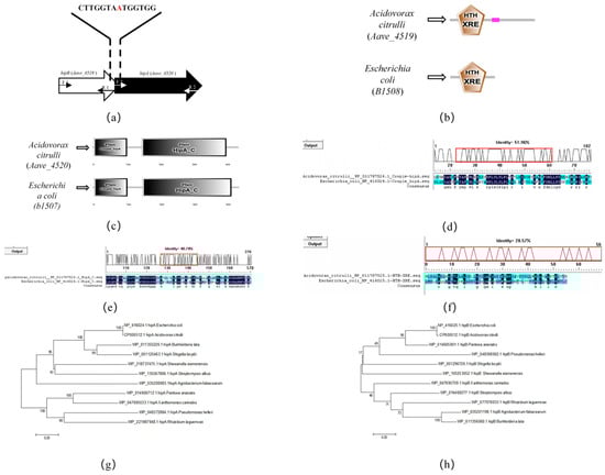Bioinformatic analysis of HipA and HipB in Acidovorax citrulli. (a) Diagram illustrating the position of hipA and hipB genes in the A. citrulli AAC00-1 genome (Genbank: CP000512.1), with the overlapping region highlighted in red. Arrows indicate primer positions for the electrophoresis analysis presented in Figure 2. (b) Domain analysis of HipA using the SMART tool (http://version10.string-db.org/, accessed on 13 April 2021). (c) Domain analysis of HipB using the SMART tool. (d) Amino acid sequence comparison of A. citrulli Aac5 and Escherichia coli Couple_hipA domains using DNAMAN, showing a similarity of 51.96%. The red box indicates the currently selected visible region in the alignment results. (e) Amino acid sequence comparison of A. citrulli Aac5 and E. coli HipA_C domains using DNAMAN, showing a similarity of 40.74%. The red box indicates the currently selected visible region in the alignment results. (f) Amino acid sequence comparison of A. citrulli Aac5 and E. coli HipB domains using DNAMAN, showing a similarity of 28.57%. The red box indicates the currently selected visible region in the alignment results. (g) Phylogenetic tree of the hipA gene. (h) Phylogenetic tree of the hipB gene.