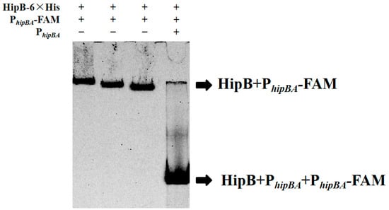 The electrophoretic mobility shift assay (EMSA) of HipB with its own promoter. Direct interaction between the HipB protein and the hipBA promoter DNA labeled with 6-carboxy-fluorescein (FAM) was detected by EMSA. Shifted bands indicate the binding of the probe DNA (PhipBA-FAM) to the HipB protein. PhipBA represents the promoter sequence of hipBA. The PhipBA was added to the incubation system to compete with the interaction between HipB and the FAM-labeled probe. PhipBA-FAM represents the fluorophore FAM attached to the 5′ of PhipBA.