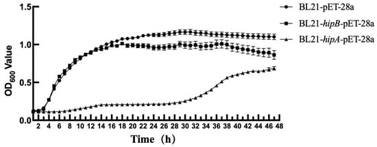 The primer pairs hipA-F/hipA-R and hipB-F/hipB-R were designed based on the sequence of the hipA gene (Aave_4520) and hipB gene (Aave_4519) in the AAC00-1 genome (Genbank accession number: CP000512.1). The hipA (1323 bp) and hipB (507 bp) genes were amplified from the genomic DNA of Aac5 using KOD-Plus-Neo (TOYOBO, Osaka, Japan) and the primers hipA-F/hipA-R and hipB-F/hipB-R. The ClonExpress II one-step cloning kit (Vazyme, Nanjing, China) was used to ligate hipA and hipB with vector pET-28a to obtain recombinant vectors hipA-pET-28a and hipB-pET-28a. These vectors were then transformed into competent E. coli BL21 and grown at 37 °C for 18 h. The empty plasmid, pET-28a, was transformed into E. coli BL21 as the control group. Single colonies were grown in LB + Kan liquid medium, with constant shaking (225 rpm) at 37 °C for 12 h. Gene-specific primers hipA-F/hipA-R and hipB-F/hipB-R were used for PCR verification, and the PCR products were sequenced at Huada Gene Co., Ltd. (Beijing, China) to confirm their accuracy. The constructed strains were stored at −80 °C with 50% glycerol in a 1:1 (v/v) ratio. Strains BL21-pET-28a, BL21-hipA-pET-28a, and BL21-hipB-pET-28a were grown on LB + Kan agar and incubated at 37 °C for 19 h. Single colonies were then grown in LB + Kan broth, with continuous shaking at 37 °C (225 rpm) for 12 h. The bacterial suspension was adjusted to a concentration of 3 × 106 CFU/mL using a spectrophotometer (Biochrom, London, UK) and added to a cell culture plate at 200 μL per well. The plate was placed in a growth curve instrument (Bioscreen C PRO, Turku, Finland) to determine the growth capacity. The OD600 value was measured every 2 h for 72 h. Each sample was tested in ten replicates, and each experiment was independently conducted three times.