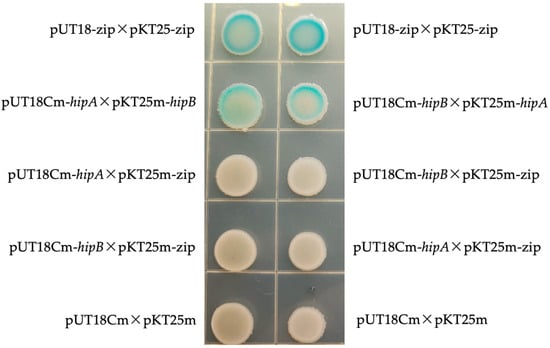 To confirm interaction between HipA and HipB proteins in A. citrulli Aac5, both yeast two-hybrid and bacterial two-hybrid experiments were conducted. In the yeast two-hybrid experiment, the target genes were fused with pGADT7 and pGBKT7 vectors and co-transformed into Saccharomyces cerevisiae Y2HGold. Although the yeast two-hybrid assay did not yield positive results on selective media (SD/-Leu/-Trp/-His/-Ade), potentially due to the limitations of the yeast system or environmental conditions, the bacterial two-hybrid experiment successfully confirmed the interaction between HipA and HipB. In the bacterial system, the target gene was amplified through PCR, fused with the plasmids pKT25m and pUT18Cm, and the resulting recombinant vectors were co-transformed into E. coli BTH101. The experimental group (pUT18Cm-hipA × pKT25m-hipB; pUT18Cm-hipB × pKT25m-hipA) and the positive control group (pUT18-zip × pKT25-zip) showed blue colonies on the LB + Amp + Kan agar (Figure 5). In contrast, the negative control group (pUT18Cm-hipA × pKT25m-zip; pUT18Cm-hipB × pKT25m-zip; pUT18Cm-hipB × pKT25m-zip; pUT18Cm-hipA × pKT25m-zip; pUT18Cm × pKT25m) did not turn blue on the LB + Amp + Kan solid medium. These results confirm the interaction between HipA and HipB proteins in A. citrulli Aac5.