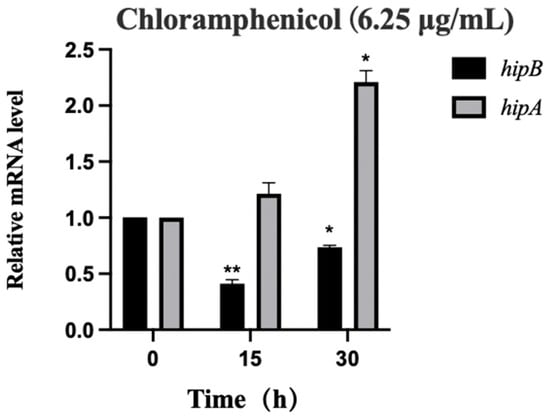 To induce stress in Aac5, a concentration of 6.25 μg/mL of chloramphenicol was selected based on the preliminary observations. We selected 15 h and 30 h as observation points to investigate the long-term adaptation of A. citrulli to chloramphenicol stress, considering that TA systems may regulate persister cell formation over extended periods. Previous studies have indicated that prolonged antibiotic exposure can induce TA-mediated dormancy [24]. Our results showed that chloramphenicol exposure (6.25 μg/mL) had a significant impact (p ≤ 0.05) on the transcription levels of hipA and hipB in Aac5 (Figure 6). After 15 h of chloramphenicol exposure, there was a significant decrease (p ≤ 0.01) in the hipB mRNA levels, while, after 30 h, the hipA mRNA levels increased by 1.2 compared to that of the initial measurement, and the hipB levels decreased by 0.3. This trend suggests a possible transition to a persister-like state, where increased toxin activity aids bacterial survival by reducing metabolic activity, while prolonged stress conditions may lead to global transcriptional regulation changes affecting hipB stability. These results have demonstrated that Aac5 activated the expression of hipA and hipB under chloramphenicol stress.