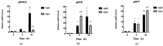 Similarly, at pH 7, the expression levels of hipA and hipB were significantly up-regulated at 3 h compared to those observed at 0 h, with hipB showing a slightly higher transcription level than hipA (Figure 7c). After 16 h, the transcription levels of both hipA and hipB significantly increased compared to those observed at 0 h, with hipA showing a higher transcription level than hipB.