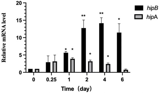 Transcriptional activation of hipA and hipB in Acidovorax citrulli Aac5 under chloramphenicol stress (6.25 μg/mL). The expression levels of each gene at 0 h in wild-type strain Aac5 were used as the reference and normalized to 1. Data analysis was performed using the 2−ΔΔCt method. Statistical analysis was conducted using Prism 9 software, (*: p < 0.05; **: p < 0.01). The experiment was conducted three times, and consistent results were obtained each time.