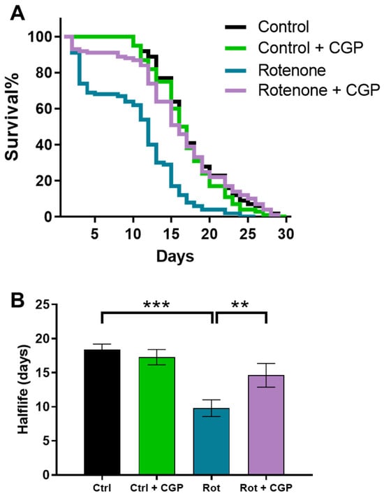 As we have previously reported [], rotenone reduces the lifespan of the worms in two phases: an initial increase in mortality, which occurs immediately after the addition of the inhibitor, and a reduction in the lifespan of the rest of the surviving population after the initial phase (Figure 1). The addition of CGP37157 rescued the worms from both effects of rotenone. It reduced the initial mortality and restored the lifespan of the rest of the population to that of control worms (Figure 1). It should be noted that the concentration used, 25 µM, produced no effect in the controls, as reported previously [], indicating that the worms treated with rotenone were more sensitive to the effect of the compound. Further details of all assays performed can be found in Supplementary Table S1.