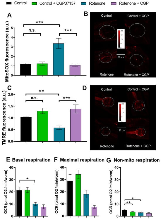 Reversal by CGP37157 of the effect of rotenone on mitochondrial ROS production and mitochondrial membrane potential, but not on oxygen consumption rate (OCR). (A,B) Mitochondrial ROS measurements with mitoSOX. (A) Means of 3 different experiments in each condition. (C,D) Mitochondrial membrane potential measurements with TMRE. The effect of complete depolarization with the protonophore CCCP is shown in Supplementary Figure S1. (C) Means of 3 different experiments in each condition. Representative images of mitoSOX or TMRE fluorescence in each condition are shown in (B,D). (E–G) OCR measurements, all obtained in control worms, worms treated with rotenone, or worms treated with rotenone + CGP37157. In OCR measurements, the protonophore FCCP was added to obtain the maximum rate of respiration and azide to obtain non-mitochondrial respiration. For OCR measurements, 3 different experiments in each condition were conducted on 3 different days. Data are means ± s.e.m. Significance was measured using Tukey’s test after ANOVA. * p < 0.05; ** p < 0.01; *** p < 0.005; n.s., not significant.