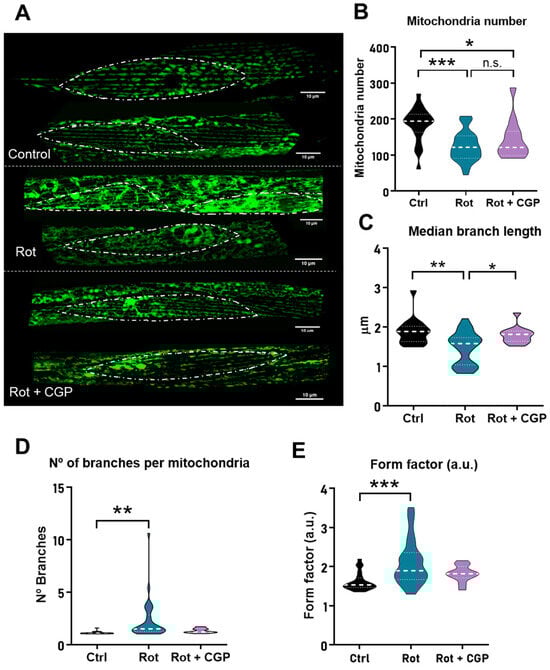 Effect of rotenone and CGP37157 on mitochondrial structure. Experiments were conducted on the SJ4103 C. elegans strain expressing mitochondrial GFP in body wall muscle. (A) A series of representative confocal images of mitochondrial fluorescence are shown in the three different conditions: control worms (n = 21), worms treated with rotenone (n = 30), and worms treated with rotenone + CGP37157 (n = 13). Bar plots show the morphological analysis of the images obtained in each condition: the mitochondrial number per cell (B), the median branch length (C), the number of branches per mitochondria (D) and the form factor (E). Statistics derived by ANOVA and means comparisons by Tukey’s test. * p < 0.05; ** p < 0.01; *** p < 0.005; n.s., not significant.