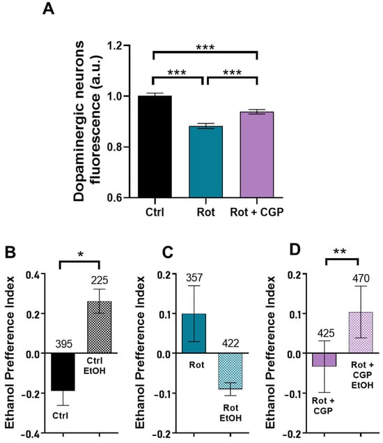 It has been reported that C. elegans worms placed in a plate containing ethanol in two opposite quadrants try to avoid the ethanol-containing quadrants []. However, after 4 h preexposure in plates containing ethanol, they instead show preference for the ethanol-containing quadrants. This behavior has been suggested as a model of complex associative learning. Moreover, dopamine synthesis was shown to be required for this behavior [], suggesting that it could be altered in our PD model. Figure 4B shows that ethanol preexposure increased ethanol preference in control worms. This behavior disappeared in the presence of rotenone (Figure 4C) and was restored by CGP37157 (Figure 4D).