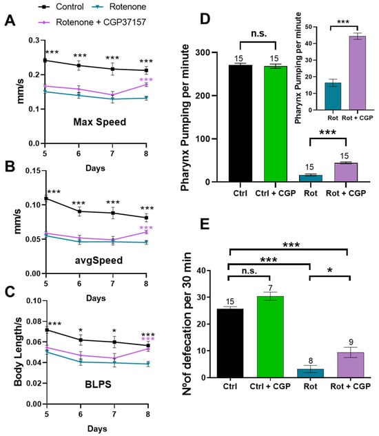 Reversal by CGP37157 of the effect of rotenone on C. elegans mobility, pharyngeal pumping, and defecation. Maximum speed (A), average speed (B), and speed measured as body length per second (BLPS; (C)). Data were obtained on days 5–8 of adult life in 3 independent experiments that included measurements of 50 control worms and 120 worms treated with either rotenone or rotenone + CGP37157. Statistical significance is shown for control vs. rotenone (black *) and rotenone vs. rotenone + CGP37157 (violet *). (D,E) Rate of pumping and rate of defecation, respectively, in either control worms or worms treated with rotenone, in both cases in the absence or in the presence of CGP37157. Data were obtained by counting the pumping rate or the defecation rate in day 3 worms. The number of worms studied in each case is indicated on top of each bar. Data are means ± s.e.m. Statistics were derived by ANOVA and means comparisons by Tukey’s test. * p < 0.05; *** p < 0.005; n.s., not significant.
