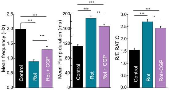 An electropharyngeogram (EPG) measures the rhythmic electrical activity of the pharyngeal muscles responsible for their rhythmic contraction to ingest food, i.e., pharyngeal pumping. It is therefore a different and more sensitive method of monitoring pharyngeal pumping, allowing direct measurement of parameters such as pump duration and intensity of the depolarization and repolarization waves. We performed experiments on control worms and worms treated with rotenone or rotenone + CGP37157, and the mean parameters obtained are shown in Figure 6. Consistently with the pumping rate measurements shown in Figure 5D, the mean pumping frequency was also reduced by rotenone and the effect of rotenone was partially reversed in the presence of CGP37157. In addition, both the mean pump duration, i.e., the interval between depolarization and repolarization, and the R/E ratio, i.e., the ratio of repolarization and depolarization waves in each pump, were increased by rotenone and partially restored by CGP37157.