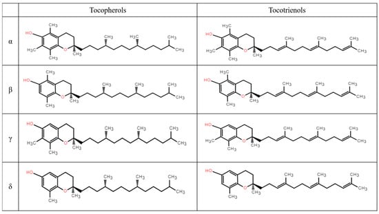 - Kamal-Eldin, A.; Appelqvist, L.A. The chemistry and antioxidant properties of tocopherols and tocotrienols. Lipids 1996, 31, 671–701. [Google Scholar] [CrossRef]