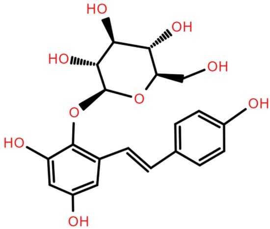 2,3,5,4′-Tetrahydroxystilbene-2-O-β-D-glucoside (TSG, Figure 1), the predominant bioactive component of Polygonum multiflorum Thunb. (P. multiflorum; commonly known as Fallopia multiflora Thunb., He shou wu, Fo-ti, or Polygoni multiflori radix), can be obtained through various extraction and purification approaches. Conventional extraction methods include aqueous decoction and ethanol reflux. Subsequent purification is commonly achieved through chromatographic separation or recrystallization. First documented in the Pharmacopoeia of China (1963) as the primary quality control marker [8], TSG has garnered attention for its potential anti-aging properties. Modern pharmacological studies have demonstrated that TSG exhibits considerable potential in mitigating aging and age-related diseases. However, the mechanisms underlying these effects remain fragmented, and comprehensive reviews focusing on TSG are limited. This review systematically consolidates the latest findings on TSG’s anti-aging properties and its protective effects against age-related pathologies, elucidating its pleiotropic mechanisms and therapeutic potential to inform future research on healthy aging interventions. Additionally, we also briefly evaluate the anti-aging effects of bioactive constituents in P. multiflorum beyond TSG, providing insights into the potential synergistic action of the said compound with other plant constituents.