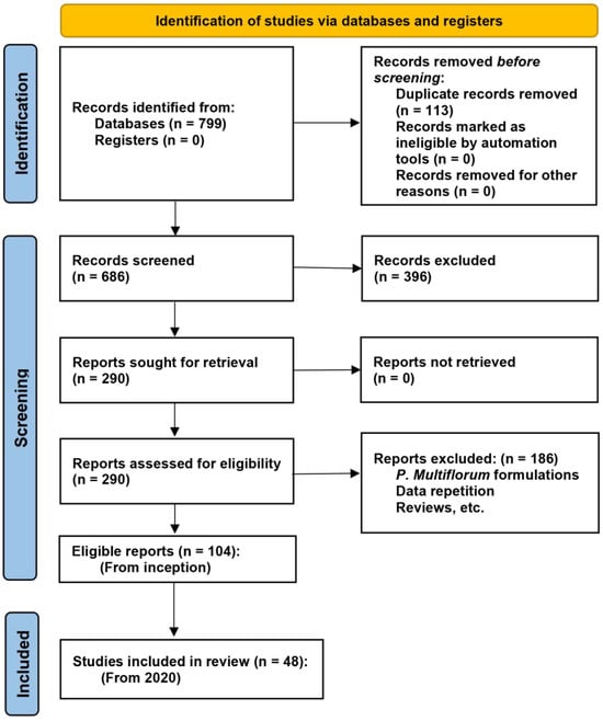 Figure 2 illustrates the study selection process. Following the screening of titles and abstracts, 290 studies were identified for full-text retrieval. After a thorough eligibility assessment, 186 studies were excluded because, e.g., they involved P. multiflorum formulations or were review articles. Consequently, 104 reports were deemed eligible for inclusion in this systematic review, encompassing studies from the inception of the databases to the present. Among these, 48 studies published within the last five years (2020–2024) were included in the final analysis. These studies were categorized by their primary focus: lifespan extension (n = 4), neuroprotection (n = 19), cardiovascular protection (n = 10), reproductive protection (n = 5), bone protection (n = 4), and others (n = 6). This selection ensured a comprehensive and up-to-date evaluation of the potential anti-aging benefits of TSG and other extracts from P. multiflorum.