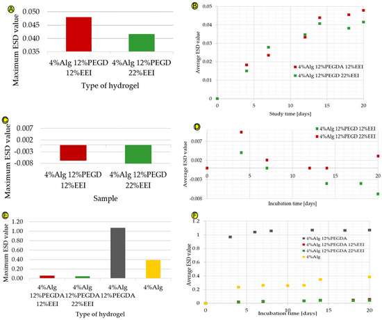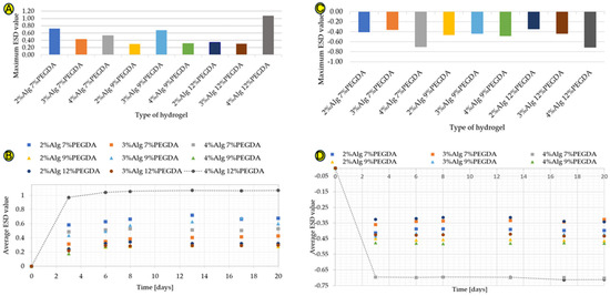 The hydrogel samples were also immersed in ethylene alcohol, simulating a hypertonic environment, in order to compare the degree of water loss with the degree of its absorption. The results shown in Figure 1C are different from those shown in Figure 1A. The highest water loss is characteristic of the 4%Alg 12%PEGDA hydrogel, whose minimum ESD result is −0.713, but a very similar ESD value is characteristic of the 4%Alg 7%PEGDA hydrogel. This value is −0.704. The similarity of the water loss for these two samples is visible in Figure 1D.