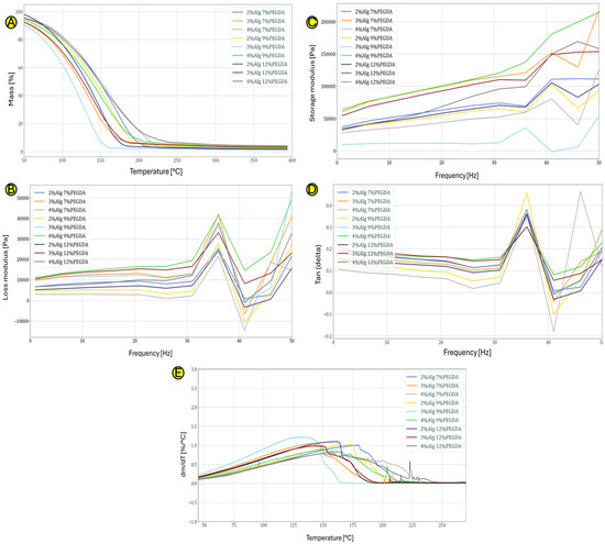 Figure 2A,B,E depict the curves showing the dependence of the loss modulus on the given test frequency obtained during the DMA test. The value of the loss modulus (Figure 2E) for all hydrogel samples from the frequency of 1 Hz to a frequency equal to 31 Hz is similar and oscillates in the range of 0–2000 Pa. With the increase of the frequency above 31 Hz, we observe fluctuations related to the energy dissipation in the hydrogels. The hydrogel sample with 4% content of sodium alginate and 12% poly(ethylene glycol) diacrylate content is characterized by average loss modulus values compared to the other hydrogels. The jump in the loss modulus around the 35 Hz value means that at this frequency, stress dissipation is more effective, which may indicate that at this frequency, the secondary bonds between the polymer chains forming the hydrogel are broken.