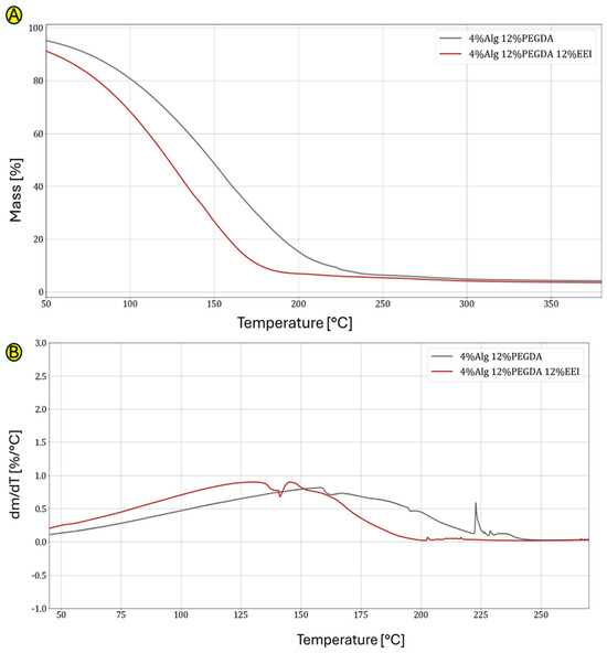 Figure 2A, which shows the curves obtained as a result of the TG test, shows the percentage loss of mass of the hydrogel samples depending on the temperature. The loss of mass is mainly due to the loss (evaporation) of water. Hydrogels in which the water is permanently bound (the strongest bonds in hydrogels occur when the bonds between polymer chains and water molecules have the highest energy) to the hydrophilic groups of the constituent polymers are characterized by its loss at higher temperatures. The 3% sodium alginate samples lose mass the fastest, probably indicating an unstable bond between the polymer skeleton of the hydrogel and the water molecules. The 4%Alg 12%PEGDA hydrogel loses mass at the slowest rate as a function of temperature, making it a potentially good choice as a material for wounds.