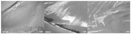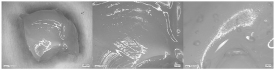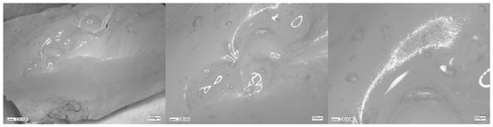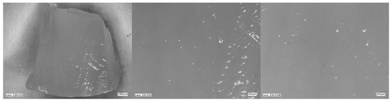 Figure 5, Figure 6, Figure 7 and Figure 8 show photos taken with a light microscope. The structure of the hydrogels obtained is homogeneous and smooth. The blisters visible in the photos were created as a result of mechanical mixing of the suspension before the cross-linking process. The structure of an ideal hydrogel dressing should be characterized by appropriate porosity. A porous scaffold promotes skin cell proliferation, ensures gas transmission and nutrient diffusion. Therefore, further work should focus on finding a suitable method to obtain a porous hydrogel with an appropriate pore size.