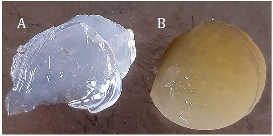 Figure 9. Hydrogel samples (A)—4%Alg 12%PEGDA, (B)—4%Alg 12%PEGDA 12%EEI. - c.