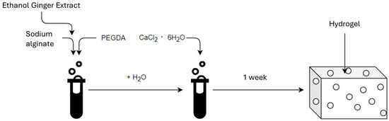 The first stage of the research was to develop a hydrogel material (Scheme 1). Powdered sodium alginate (Alg), (ACROS Organic, Thermo Fisher Scientific, Geel, Belgium) and liquid polyethylene glycol diacrylate (PEGDA Mn = 700), (Sigma-Aldrich, Burlington, MA, USA) were used to produce the hydrogel matrix. Hydrated calcium chloride (6 H2O groups) CZDA (POCH Avantor Performance Materials Poland S.A., Gliwice, Poland) was used to cross-link the hydrogels. The ginger ethanol modifier was obtained using ginger powder (Kamis, Croton Falls, NY, USA) and anhydrous ethyl alcohol 99,8% CZDA (POCH Avantor Performance Materials Poland S.A., Gliwice, Poland).