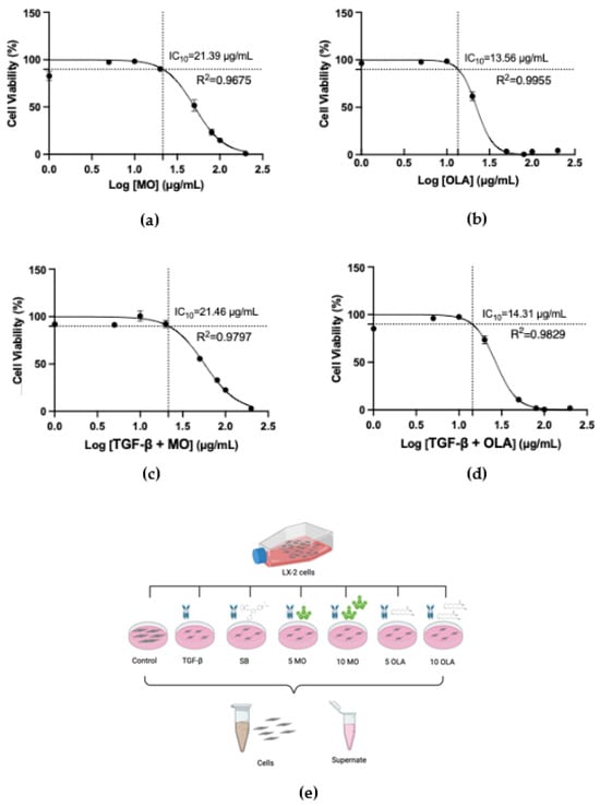Crude extract from MO was prepared using a solvent mixture of Tween20 and dimethyl sulfoxide (DMSO), and OLA was dissolved in this solvent. HSC activation is a critical process during hepatic fibrosis. This study used the human LX-2 cell line, which is characterized as an HSC cell line. Firstly, the cytotoxicity of MO crude extract and OLA in the concentration range of 0–200 μg/mL on untreated cells and LX-2 cells induced by TGF-β1 was determined by the resazurin reduction assay. After 48 h incubation, concentrations 10 μg/mL of MO crude extract and OLA were found not to be toxic to >90% (IC10) of the cells (Figure 1a–d). We selected two concentrations of MO crude extract and OLA (5, 10 μg/mL) for further investigation. Figure 1e presents a schematic diagram of the experimental design.