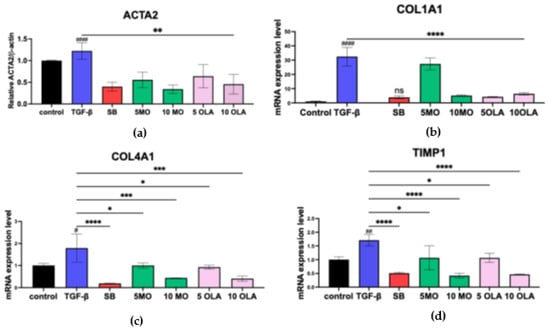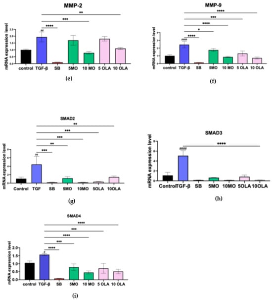 Effects of OLA identified from the MO leaves on mRNA expression. The expressions of (a) ACTA2, (b) COL1A1, (c) COL4A1, (d) TIMP1, (e) MMP2, (f) MMP9, (g) SMAD2, (h) SMAD3 and (i) SMAD4 were assessed using real-time qRT-PCR. GAPDH served as the internal control. Control: untreated; TGF-β: transforming growth factor-beta 10 ng/mL; SB:SB431542 10 mM, 5 MO: Moringa oleifera leaf extract 5 μg/mL; 10 MO: MO 10 μg/mL; 5 OLA: oleamide 5 μg/mL; 10 OLA: OLA 10 μg/mL. Data are represented as mean ± SD. # p < 0.05, ## p < 0.01, #### p < 0.0001 compared to control, * p = 0.0240, ** p = 0.0034, *** p = 0.0005 and **** p ≤ 0.0001 compared to the TGF-β1-treated group; ns: not significant.