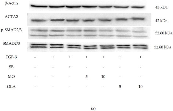 Following the observed reduction in the expression of key fibrosis-related and SMAD signaling genes ACTA2, COL1A1, COL4A1, TIMP-1, MMP-2, MMP-9, SMAD2, SMAD3 and SMAD4 after OLA treatment, we confirmed these findings by analyzing protein levels using immunoblot analysis. In untreated cells, the protein levels of ACTA2, p-SMAD2/3 and SMAD2/3 were low. However, TGF-β1 treatment markedly induced the production of these proteins, as shown in Figure 4a. Consistent with expectations, OLA significantly suppressed TGF-β1-induced production of ACTA2, p-SMAD2/3 and SMAD2/3 in a concentration-dependent manner, as demonstrated in Figure 4b–f.
