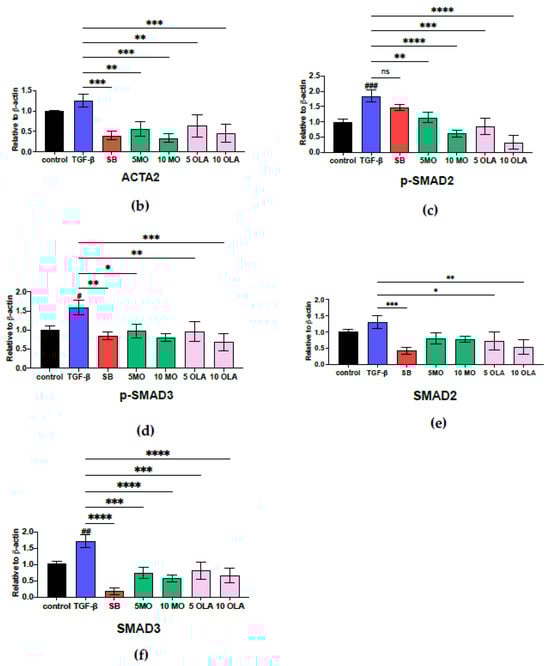 Effects of MO and OLA on ACTA2, p-SMAD2/3 and SMAD2/3 protein production. The quantitative protein production of ACTA2, p-SMAD2/3 and SMAD2/3 was measured by Western blotting (a). The bar graphs represent the relative expression of these proteins after normalization to β-actin (b–f). Control: untreated; TGF-β: transforming growth factor-beta 10 ng/mL; SB:SB431542 10 mM, 5 MO: Moringa oleifera leaf extract 5 μg/mL; 10 MO: MO 10 μg/mL; 5 OLA: oleamide 5 μg/mL; 10 OLA: OLA 10 μg/mL. Data are represented as mean ± SD. # p < 0.0001 ## p < 0.01, ### p < 0.001 compared to control, * p ≤ 0.1, ** p ≤ 0.01, *** p ≤ 0.001 and **** p ≤ 0.0001 compared to the control * p < 0.0001 indicates statistical significance compared to the TGF-β1-treated group; ns: not significant.