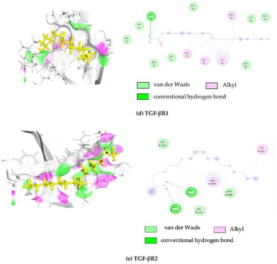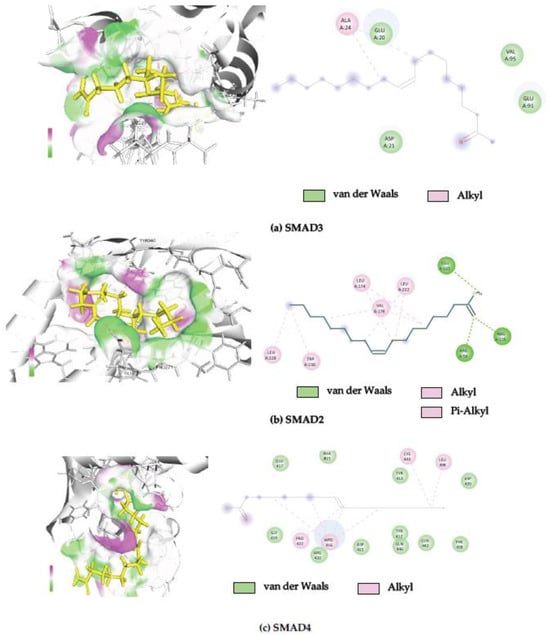 Binding interactions between OLA and potential protein targets were examined using the cavity detection-guided blind docking capabilities of the SWISS-dock web-based platform. Findings including Autodock Vina binding scores and the amino acids involved in the interactions are detailed in Table 1. A visualization of the protein–ligand interactions in 2D and 3D formats is shown in Figure 5. Of particular interest, OLA displayed favorable binding scores (−6 to −8 Kcal/mol) with target proteins known to participate in the SMAD signaling pathway.