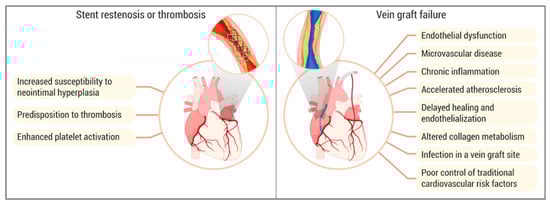 The use of veins for grafting is suboptimal as a long-term substitute for arteries. Over time, the vein undergoes “arterialization”, but this process is often incomplete in diabetic patients. Inadequate adaptation of the vein to the arterial environment leads to graft failure []. Several factors contribute to this, including 1. endothelial dysfunction, which is particularly relevant in vein grafts, as they depend on a healthy endothelium for proper function and patency []; 2. microvascular disease affecting small blood vessels in grafted veins, which leads to reduced blood flow and poor graft healing []; 3. chronic inflammation in the graft and surrounding tissue promoting intimal hyperplasia, which contributes to graft stenosis and occlusion [,]; 4. accelerated atherosclerosis [,]; 5. delayed healing and endothelialization, combined with platelet dysfunction and a hypercoagulable state which increase the risk of thrombosis and occlusion in the early postoperative period []; 6. altered collagen metabolism resulting in abnormal collagen formation, which weakens the graft and increases the risk of its failure []; 7. oxidative stress, which worsens endothelial dysfunction, promotes inflammation, and accelerates atherosclerosis in vein grafts, contributing to graft failure []; 8. hyperglycemia causing non-enzymatic glycation of proteins and formation of AGEs, impairing the function of collagen, elastin, and other extracellular matrix proteins in vein grafts, and resulting in premature failure []; 9. infection at the graft site, which disrupts the healing process, promotes thrombosis, and induces inflammation []; and 10. poor control of cardiovascular risk factors such as dyslipidemia and hypertension, further increasing the likelihood of graft failure [].