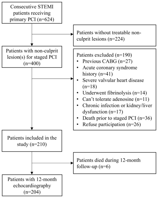 Between January 2021 and July 2022, 624 consecutive STEMI patients underwent PPCI. Of those, 400 had non-culprit lesion(s) and 190 met one of the exclusion criteria. Hence, 210 patients were included. Over the 12-month follow-up period, six patients died. Therefore, 12-month echocardiography data were available for 204 patients (Figure 1). The median age was 65 (IQR 57–76) years and 81 patients (39.7%) were female.